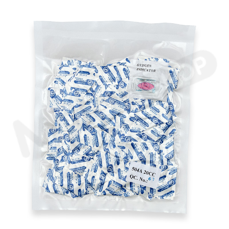 All full packs of 20cc oxygen absorbers (200 absorbers) come with OxyEyeTMÂ oxygen indicator that changes colour from pale pink to dark blue/purple when exposed to oxygen.
